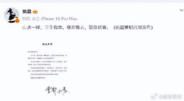 根据极目新闻报道显示,3月16日姚晨发了条微博,标题起得挺文艺:“山水一程,三生有幸,缘来缘去,皆是欢喜。”