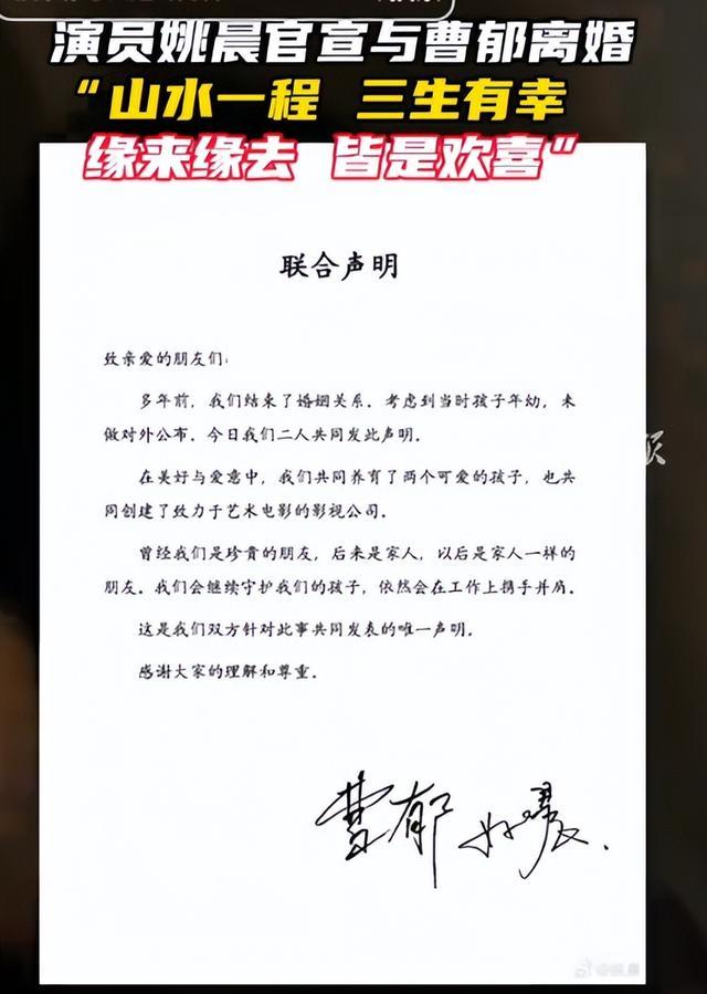 配图是一份联合声明,落款是她和曹郁,,声明里写得清楚:“多年前,我们结束了婚姻关系,考虑到当时孩子年幼,未做对外公布。”