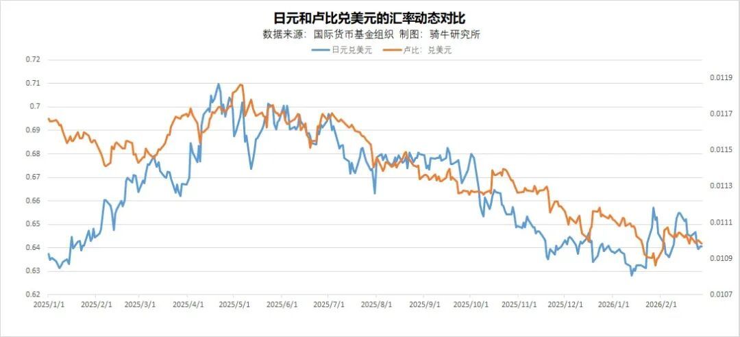 2025年底与年初对比,日元兑美元升值0.13%,印度卢比兑美元则下跌了4.7%。
