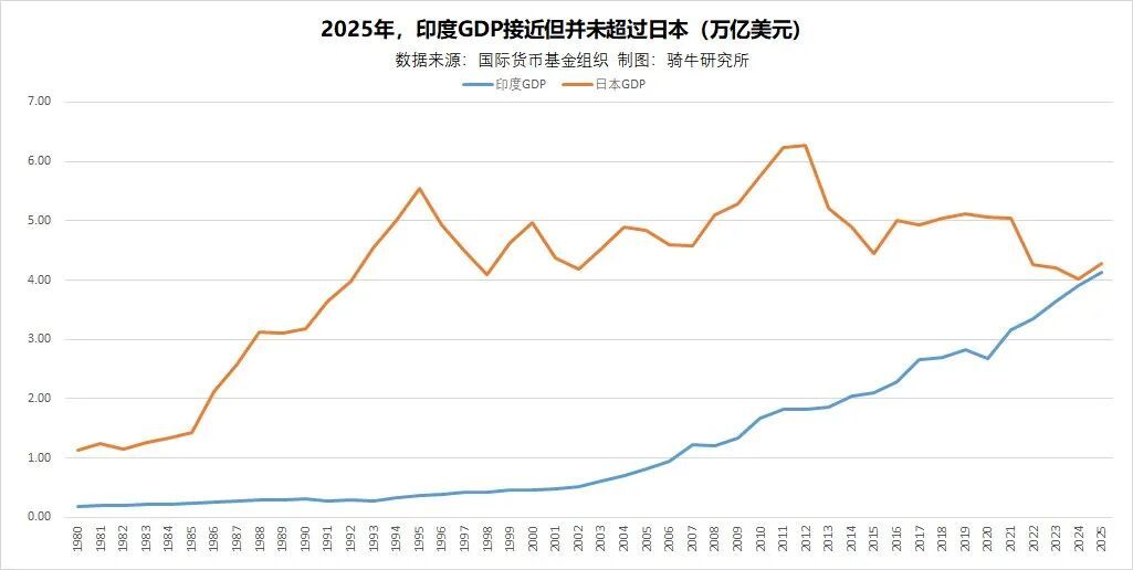 2025年印度超越日本成为全球第四大经济体的预测落空。根据IMF数据,2025年印度GDP为4.13万亿美元,日本为4.28万亿美元,印度仍排全球第五,落后3.5%。主要原因是卢比兑美元贬值约5%,而日元小幅升值。印度虽经济增长较快,但2026年能否超越日本仍存在较大不确定性。