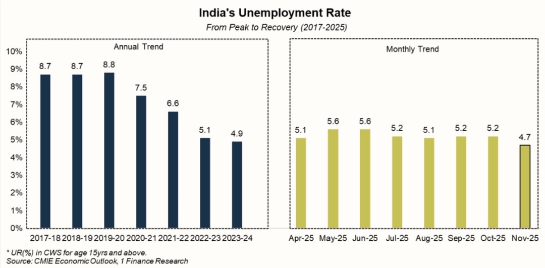 但乐观的报告与严峻的现实存在差距。2025年印度失业率平均为5.1%,与2024年的4.9%相比,明显上升。为此,总理纳伦德拉·莫迪宣布了全面的消费税减免,并在截至3月31日的12个月内经济增长降至四年低点后,推动了劳动法改革。