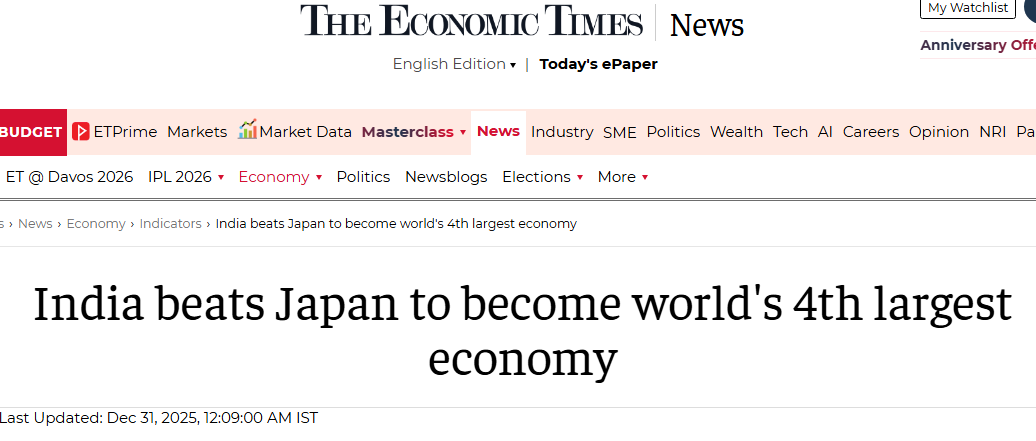 2025年12月31日,印度的《经济时报》利用印度政府统计机构预测的数据报道称,根据印度政府年终经济评估的计算,印度的经济规模击败日本,成为世界第四大经济体。印度人在报道中非常自豪地表示,印度经济在持续高速增长后,已超越日本,成为世界第四大经济体。经济步伐显然比预期更快。印度人还在报道中表示,印度经济可能在未来三年内超越德国,成为仅次于美国和中国的全球第三大经济体。