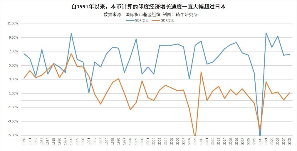 尽管印度经济增长速度更快,2024-2025年均增长超过7%,而日本约为1%,但用美元衡量全球排名,货币价格(本币兑美元)走势延缓了印度经济的“超车”日本的时刻。